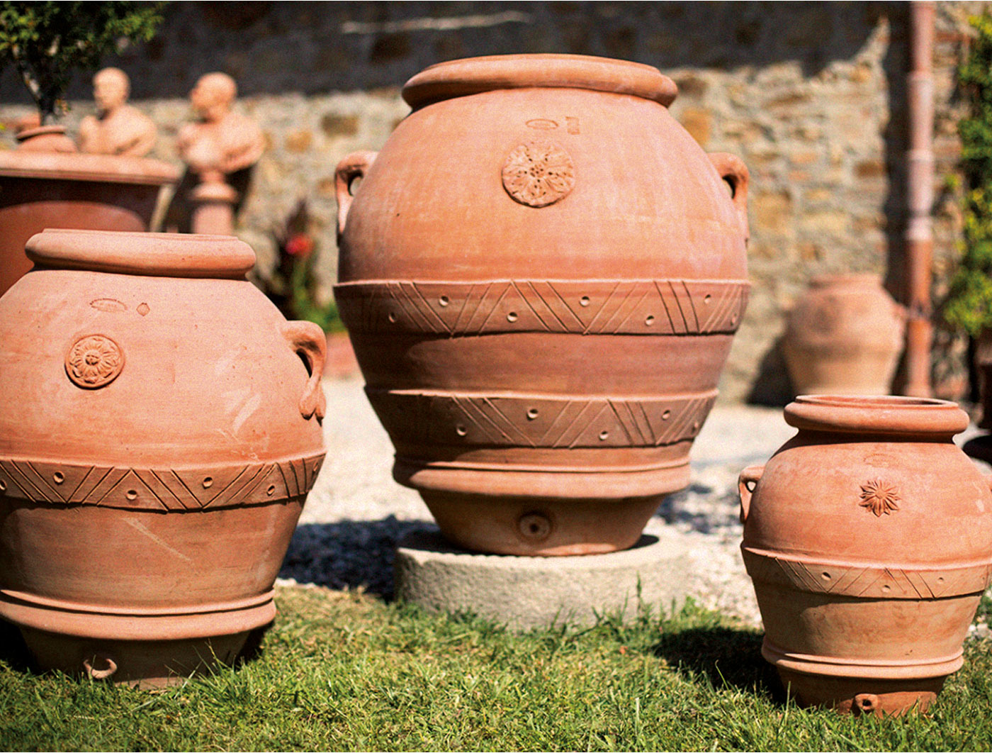 Terrakotta Produkte aus Impruneta unterscheiden sich in vielen Merkmalen von anderen Terracotta Produktionen und Arten. Das liegt an der besonderen Beschaffenheit des Gebietes und der speziellen chemischen Zusammensetzung des Tons. Der einmal bearbeitete, gebrannte Rohstoff verleiht dem Produkt eine besonders hohe Resistenz gegen Frost und seine typische warme Färbung voller Farbnuancen. Die einzigartige Qualität der Produkte Imprunetas ermöglicht es, diese harmonisch in jedes Ambiente einzupassen. Jedes Produkt wird nach alter Tradition liebevoll handgefertigt.