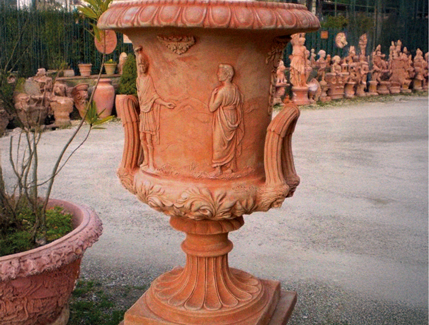 Terrakotta Produkte aus Impruneta unterscheiden sich in vielen Merkmalen von anderen Terracotta Produktionen und Arten. Das liegt an der besonderen Beschaffenheit des Gebietes und der speziellen chemischen Zusammensetzung des Tons. Der einmal bearbeitete, gebrannte Rohstoff verleiht dem Produkt eine besonders hohe Resistenz gegen Frost und seine typische warme Färbung voller Farbnuancen. Die einzigartige Qualität der Produkte Imprunetas ermöglicht es, diese harmonisch in jedes Ambiente einzupassen. Jedes Produkt wird nach alter Tradition liebevoll handgefertigt.