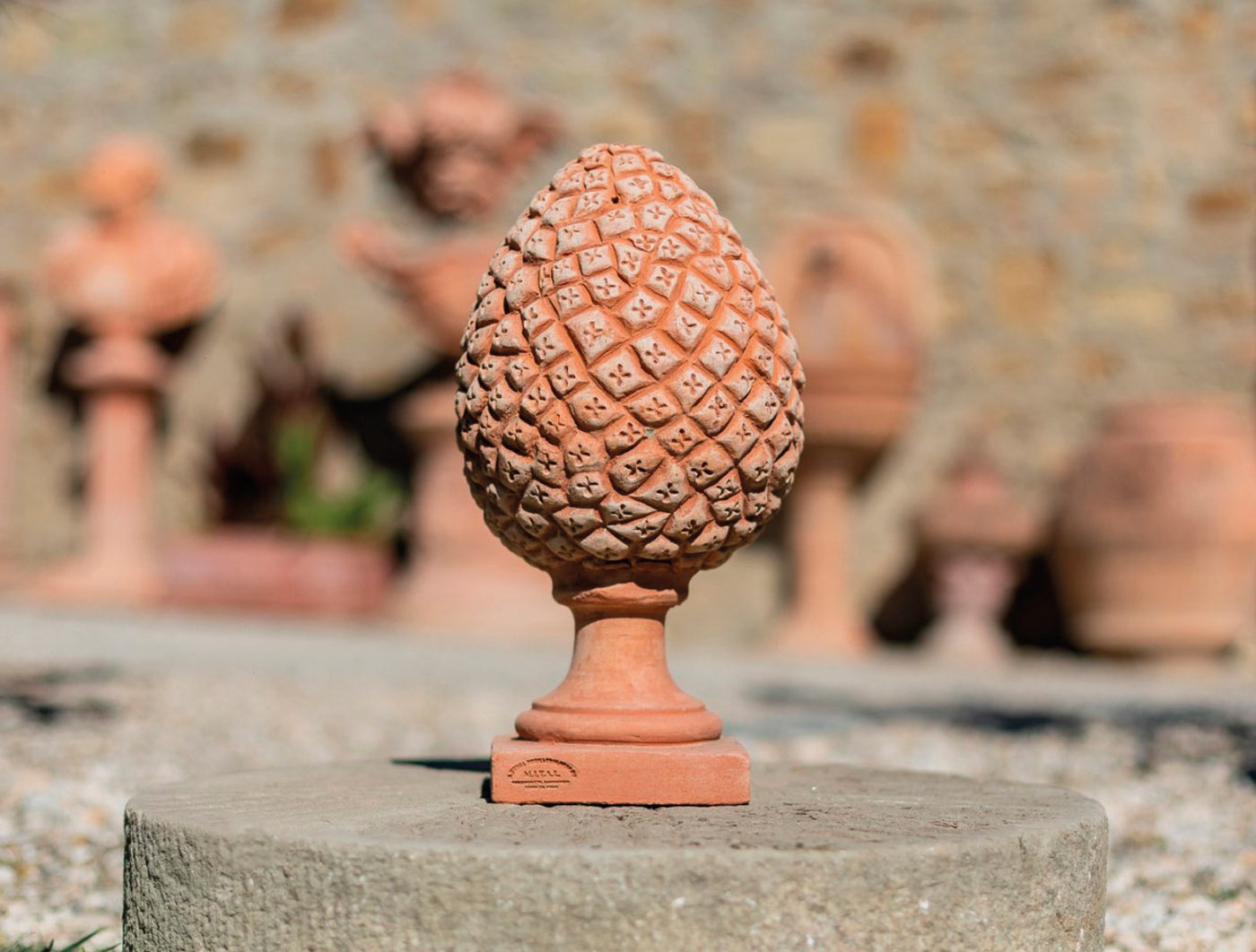 Terrakotta Produkte aus Impruneta unterscheiden sich in vielen Merkmalen von anderen Terracotta Produktionen und Arten. Das liegt an der besonderen Beschaffenheit des Gebietes und der speziellen chemischen Zusammensetzung des Tons. Der einmal bearbeitete, gebrannte Rohstoff verleiht dem Produkt eine besonders hohe Resistenz gegen Frost und seine typische warme Färbung voller Farbnuancen. Die einzigartige Qualität der Produkte Imprunetas ermöglicht es, diese harmonisch in jedes Ambiente einzupassen. Jedes Produkt wird nach alter Tradition liebevoll handgefertigt.